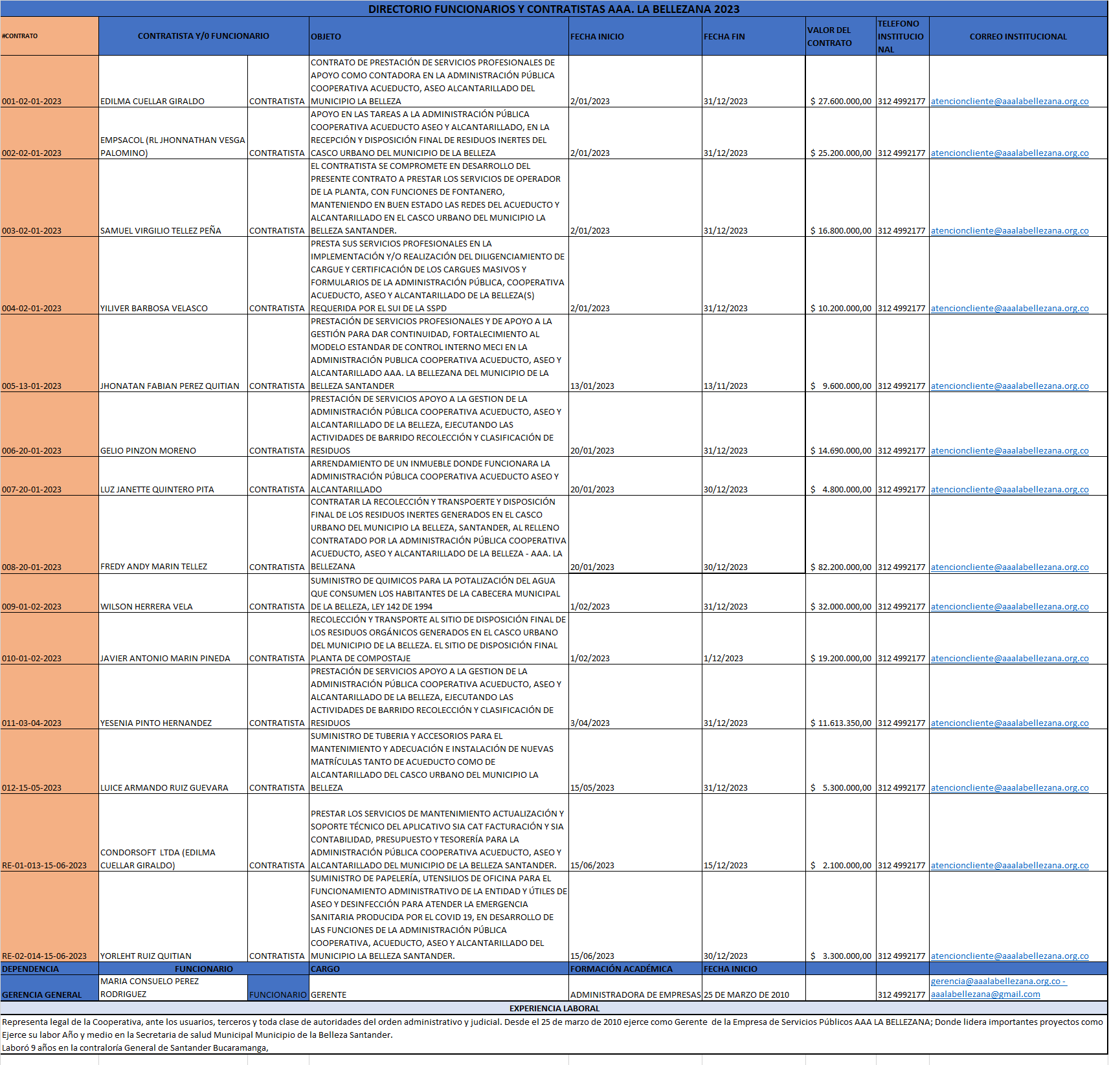 OBJETO: PRESTAS LOS SERVICIOS PROFESIONALES EN EL APOYO A LA IMPLEMENTACION DE LA ESTRATEGIA DE GOBIERNO EN LINEA EN SUS DIFERENTES COMPONENTES, Y ACTUALIZACION DE LA PAGINA WEB INSTITUCIONAL Y PRESENTACION DE INFORMES A LAS PLATAFORMAS DE SIGEP, SIA OBSERVA Y SECOP DE LA ADMINISTRACION PUBLICA COOPERATIVA DE ACUEDUCTO, ASEO Y ALCANTARILLADO LA BELLEZANA.